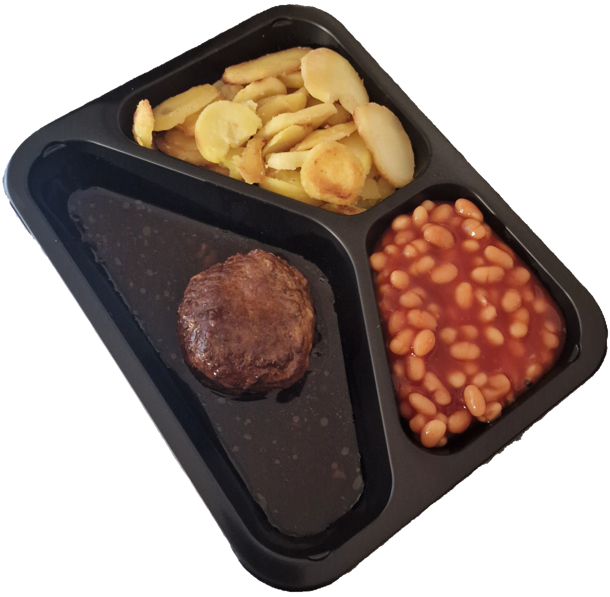 Aardappelschijfjes met witte bonen in tomatensaus en een gehaktbal.