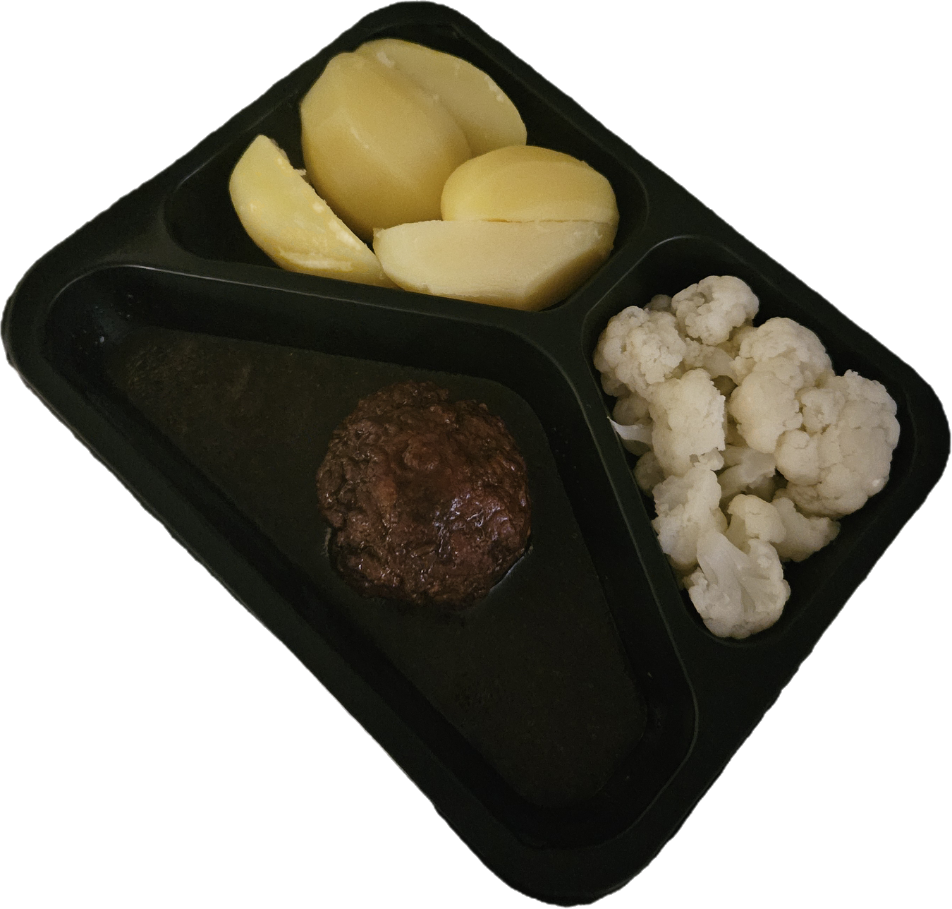 Maaltijd 1: Gekookte aardappelen met bloemkool en een gehaktbal