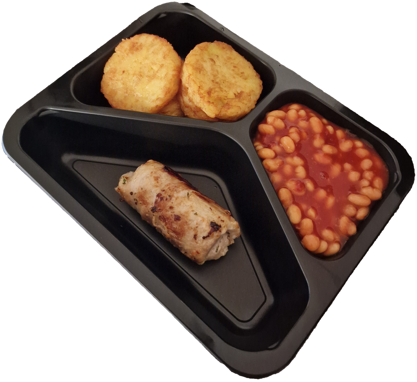 Röstirondjes met witte bonen in tomatensaus en een slavink