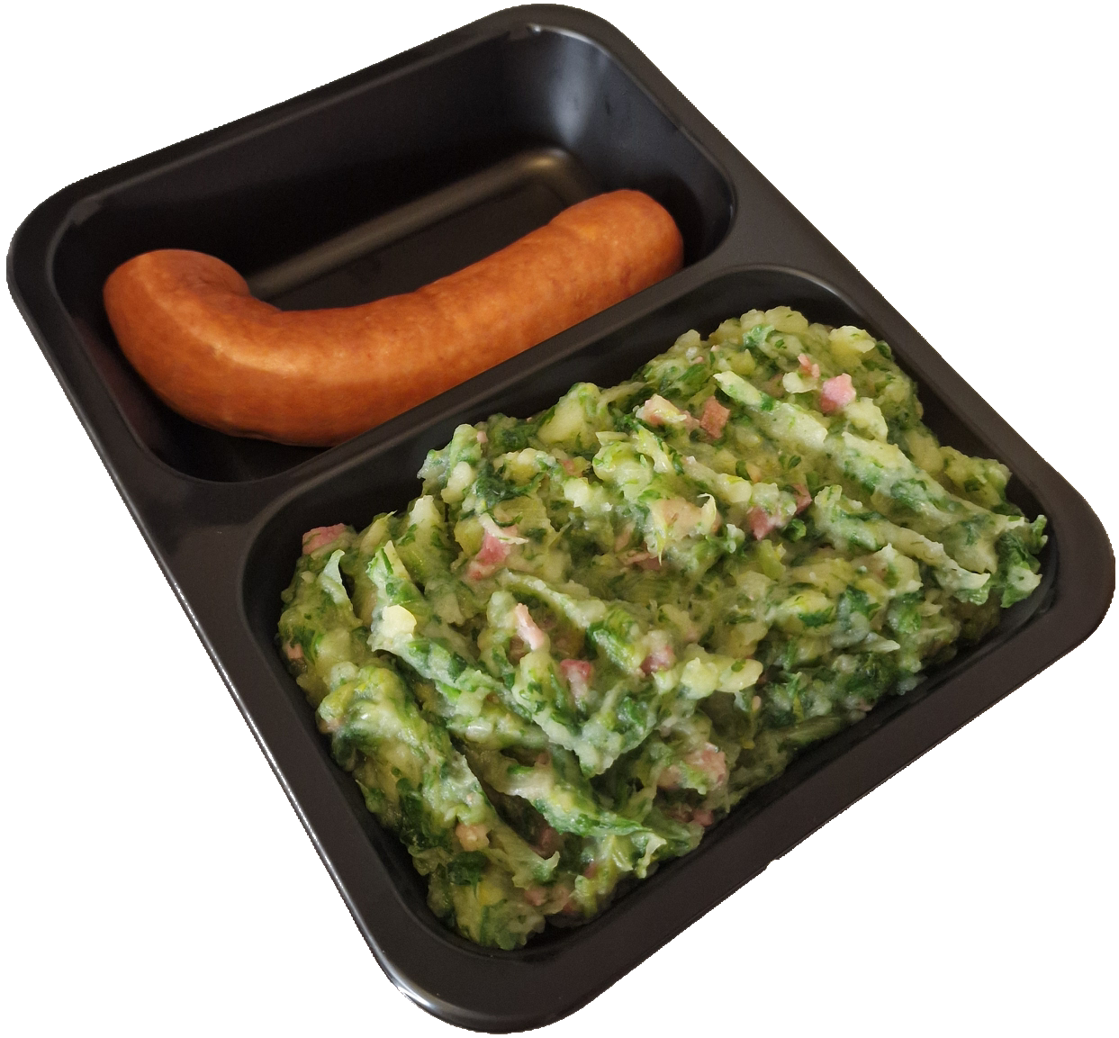 Heerlijke stamppot andijvie met uitgebakken spekjes en overheerlijk rookworst.